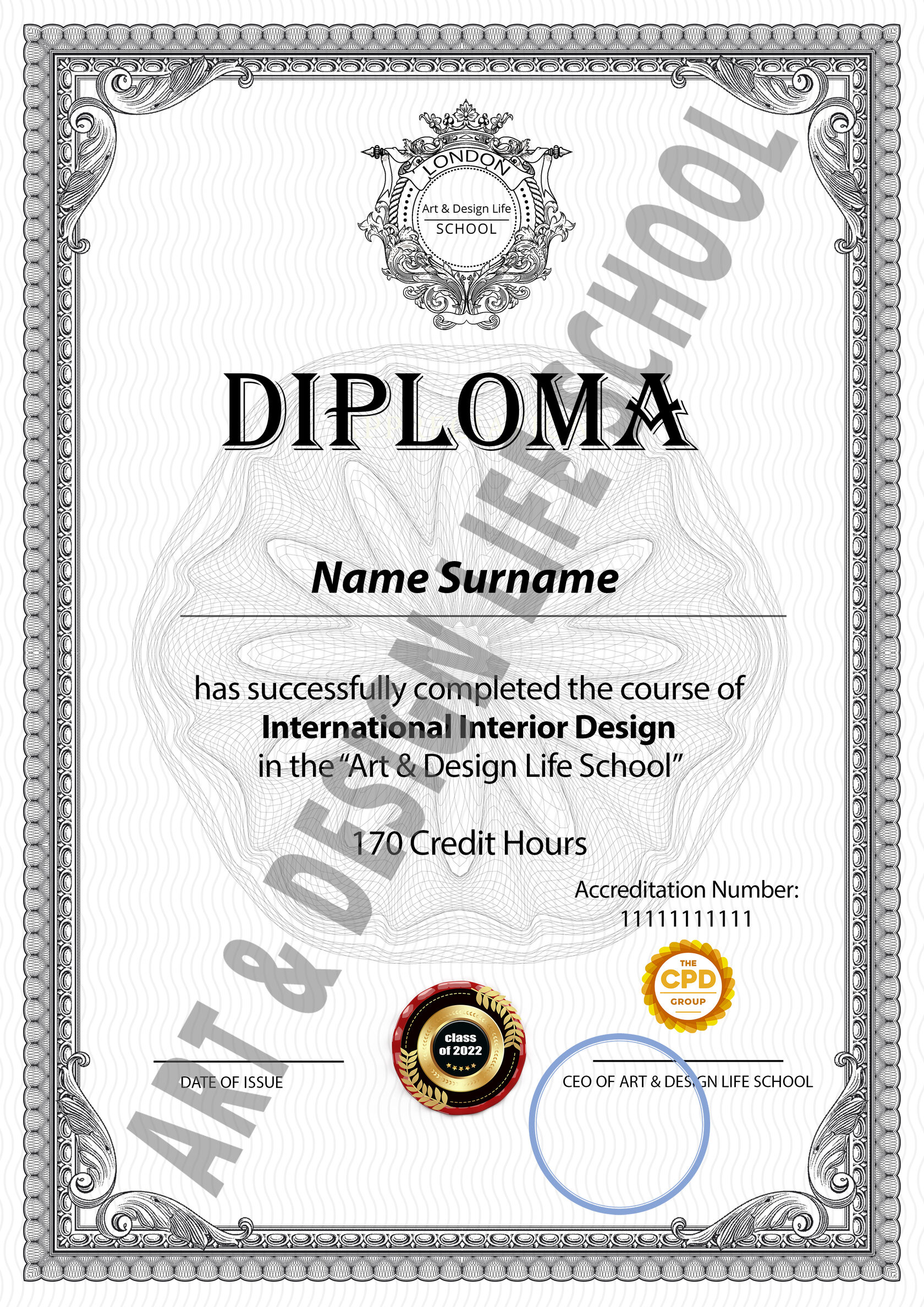 При успешном окончании обучения Вы получаете ДИПЛОМ международного образца по специальности "Международный дизайнер интерьера"