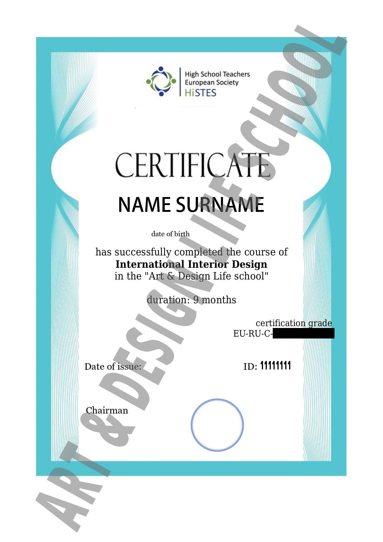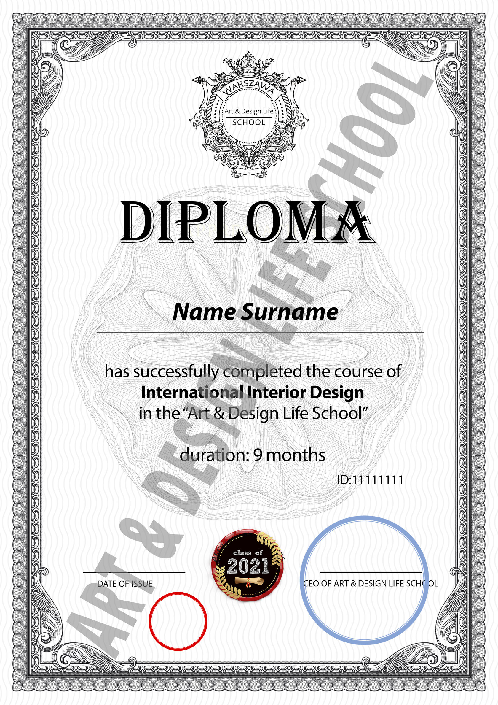 При успешном окончании обучения Вы получаете ДИПЛОМ международного образца по специальности "Международный дизайнер интерьера"